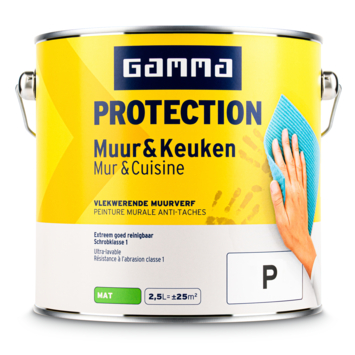 Met GAMMA Protection muur & keuken mengbare muurverf mat 2,5 liter breng je een beschermende verflaag aan met de speciaal door GAMMA ontwikkelde Protection technologie. Deze technologie zorgt voor een vlekwerende verflaag die is bedoeld voor plekken waar muren sneller vuil worden, zoals in de keuken of bij veel gebruikt woonruimtes.