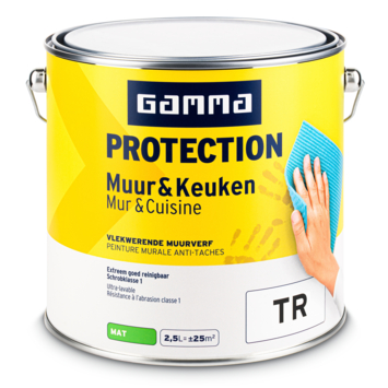 Met GAMMA Protection muur & keuken mengbare muurverf mat 2,5 liter breng je een beschermende verflaag aan met de speciaal door GAMMA ontwikkelde Protection technologie. Deze technologie zorgt voor een vlekwerende verflaag die is bedoeld voor plekken waar muren sneller vuil worden, zoals in de keuken of bij veel gebruikt woonruimtes.