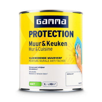Met GAMMA Protection muur & keuken muurverf moonlight RAL 9010 mat 1 liter breng je een beschermende verflaag aan met de speciaal door GAMMA ontwikkelde Protection technologie. Deze technologie zorgt voor een vlekwerende verflaag die is bedoeld voor plekken waar muren sneller vuil worden, zoals in de keuken of bij veel gebruikt woonruimtes.