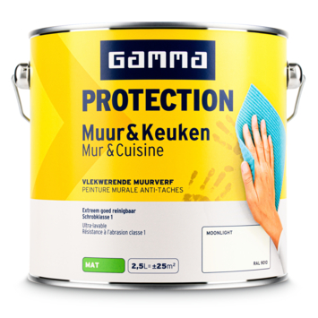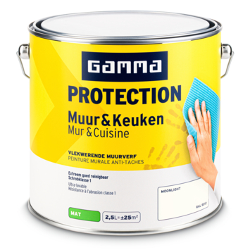 Met GAMMA Protection muur & keuken muurverf moonlight RAL 9010 mat 2,5 liter breng je een beschermende verflaag aan met de speciaal door GAMMA ontwikkelde Protection technologie. Deze technologie zorgt voor een vlekwerende verflaag die is bedoeld voor plekken waar muren sneller vuil worden, zoals in de keuken of bij veel gebruikt woonruimtes.