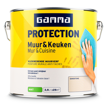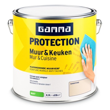 Met GAMMA Protection muur & keuken muurverf sandstone mat 2,5 liter breng je een beschermende verflaag aan met de speciaal door GAMMA ontwikkelde Protection technologie. Deze technologie zorgt voor een vlekwerende verflaag die is bedoeld voor plekken waar muren sneller vuil worden, zoals in de keuken of bij veel gebruikt woonruimtes.