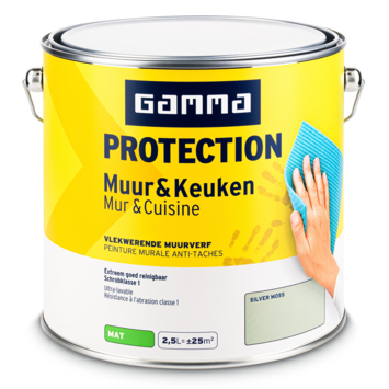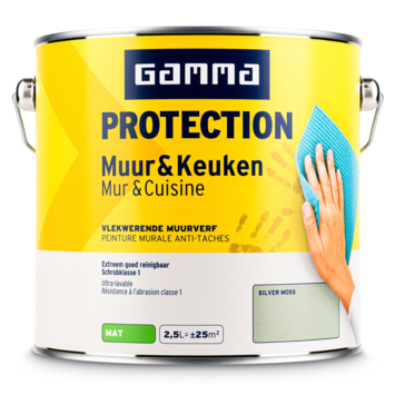 Met GAMMA Protection muur & keuken muurverf silver moss mat 2,5 liter breng je een beschermende verflaag aan met de speciaal door GAMMA ontwikkelde Protection technologie. Deze technologie zorgt voor een vlekwerende verflaag die is bedoeld voor plekken waar muren sneller vuil worden, zoals in de keuken of bij veel gebruikt woonruimtes.