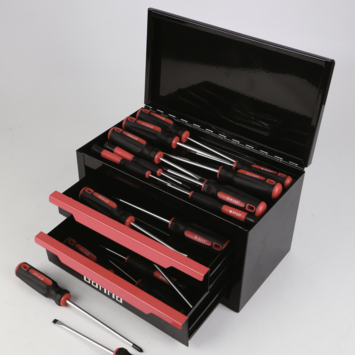 Robuuste en compacte metalen gereedschapkast met 2 lades en bakje. Ideaal voor klein gereedschap, accessoires zoals schroefjes, ringen of moeren en bijv. knutselspullen.
