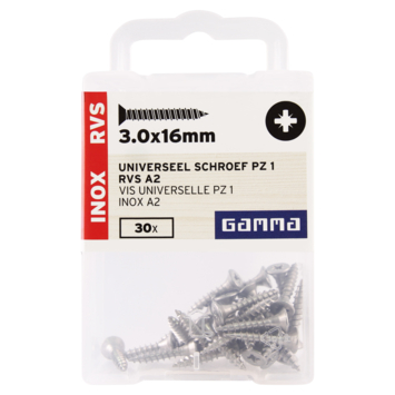 Deze kleine platkopschroeven van GAMMA zijn gemaakt van roestvrij staal en universeel te gebruiken. De kop is van het type PZ 1, platverzonken en heeft een pozi-aandrijving. U kunt deze standaardschroeven dus gebruiken met een kruiskopschroevendraaier. De schroef heeft draad over de hele lengte, en geeft daarmee veel grip in de materie. De schroef is voorzien van een glijlaag voor een betere verwerking. De schroeven hebben een lengte van 16mm en een diameter van 3mm. Ze zijn zowel binnen als buiten te gebruiken in spaanplaat en hout. Eén verpakking bevat 30 stuks.