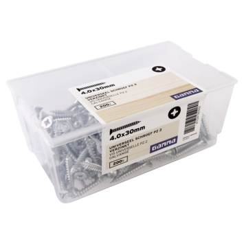 Deze schroeven van GAMMA zijn gemaakt van verzinkt staal en universeel te gebruiken. Ze hebben een platverzonken kop van het type PZ 2 en een pozi-aandrijving. U kunt deze standaardschroeven dus gebruiken met een kruiskopschroevendraaier. De schroef heeft draad over de hele lengte, en heeft daarmee veel grip in de materie. De voldraadschroef is voorzien van een glijlaag voor een betere verwerking. De schroeven hebben een lengte van 30mm en een diameter van 4mm. Ze zijn zowel binnen als buiten te gebruiken in spaanplaat en hout. Eén verpakking bevat 200 stuks.