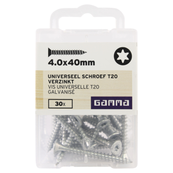 Deze platkopschroeven van GAMMA zijn gemaakt van verzinkt staal en universeel te gebruiken. De schroef is van het type T20, met een platverzonken kop en een torx-aandrijving. De schroef heeft draad over de hele lengte, en geeft daarmee veel grip in de materie. De voldraadschroef is voorzien van een waslaag voor een betere verwerking. De verpakking bevat schroeven met een lengte van 40mm en een diameter van 4mm. De schroeven zijn zowel binnen als buiten te gebruiken in spaanplaat en hout. Eén verpakking bevat 30 stuks.