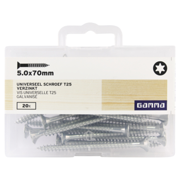 Deze platkopschroeven van GAMMA zijn gemaakt van verzinkt staal en universeel te gebruiken. De schroef is van het type T25, met een platverzonken kop en een torx-aandrijving. U kunt de schroef dus goed indraaien met een torx-schroevendraaier. De deeldraadschroef is voorzien van een waslaag voor een betere verwerking. De verpakking bevat schroeven met een lengte van 70mm en een diameter van 5mm. De schroeven zijn zowel binnen als buiten te gebruiken in spaanplaat en hout. Eén verpakking bevat 20 stuks.