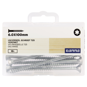 Deze platkopschroeven van GAMMA zijn gemaakt van verzinkt staal en universeel te gebruiken. De schroef is van het type T25, met een platverzonken kop en een torx-aandrijving. U kunt de schroef dus goed indraaien met een torx-schroevendraaier. De deeldraadschroef is voorzien van een waslaag voor een betere verwerking. De verpakking bevat schroeven met een lengte van 100mm en een diameter van 6mm. De schroeven zijn zowel binnen als buiten te gebruiken in spaanplaat en hout. Eén verpakking bevat 10 stuks.
