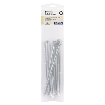 Deze platkopschroeven van GAMMA zijn gemaakt van verzinkt staal en universeel te gebruiken. De schroef is van het type T25, met een platverzonken kop en een torx-aandrijving. U kunt de schroef dus goed indraaien met een torx-schroevendraaier. De deeldraadschroef is voorzien van een waslaag voor een betere verwerking. De verpakking bevat schroeven met een lengte van 140mm en een diameter van 6mm. De schroeven zijn zowel binnen als buiten te gebruiken in spaanplaat en hout. Eén verpakking bevat 12 stuks.