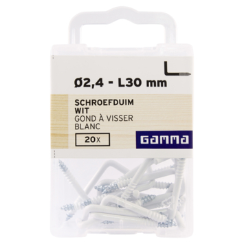 Deze schroefduim van GAMMA is gemaakt van wit metaal. De schroefduim is 30mm lang. Schroefduimen hebben een normale schroefdraad. Ze lenen zich goed om zwaardere voorwerpen aan op te hangen. In menig huishouden hangt dan ook een schilderij, spiegel of klok aan een schroefduim in de muur. Een koord, ijzerdraadje of lint blijft uitstekend haken achter de schroefduim. Naast. schroefduimen zijn er ook schroefhaken van GAMMA met hetzelfde doel. Schroefhaken zijn voorzien van een ring, terwijl schroefduimen recht zijn. Eén verpakking bevat 20 stuks witte schroefduimen.