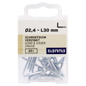 Deze schroefduim van GAMMA is gemaakt van verzinkt staal. De schroefduim is 30mm lang. Schroefduimen hebben een normale schroefdraad. Ze lenen zich goed om zwaardere voorwerpen aan op te hangen. In menig huishouden hangt dan ook een schilderij, spiegel of klok aan een schroefduim in de muur. Een koord, ijzerdraadje of lint blijft uitstekend haken achter de schroefduim. Naast. schroefduimen zijn er ook schroefhaken van GAMMA met hetzelfde doel. Schroefhaken zijn voorzien van een ring, terwijl schroefduimen recht zijn. Eén verpakking bevat 20 stuks schroefduimen.