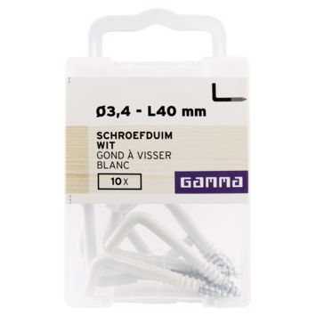 Deze schroefduim van GAMMA is gemaakt van wit metaal. De schroefduim is 40mm lang. Schroefduimen hebben een normale schroefdraad. Ze lenen zich goed om zwaardere voorwerpen aan op te hangen. In menig huishouden hangt dan ook een schilderij, spiegel of klok aan een schroefduim in de muur. Een koord, ijzerdraadje of lint blijft uitstekend haken achter de schroefduim. Naast. schroefduimen zijn er ook schroefhaken van GAMMA met hetzelfde doel. Schroefhaken zijn voorzien van een ring, terwijl schroefduimen recht zijn. Eén verpakking bevat 10 stuks schroefduimen.