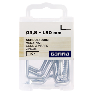 Deze schroefduim van GAMMA is gemaakt van verzinkt staal. De schroefduim is 50mm lang. Schroefduimen hebben een normale schroefdraad. Ze lenen zich goed om zwaardere voorwerpen aan op te hangen. In menig huishouden hangt dan ook een schilderij, spiegel of klok aan een schroefduim in de muur. Een koord, ijzerdraadje of lint blijft uitstekend haken achter de schroefduim. Naast. schroefduimen zijn er ook schroefhaken van GAMMA met hetzelfde doel. Schroefhaken zijn voorzien van een ring, terwijl schroefduimen recht zijn. Eén verpakking bevat 10 stuks schroefduimen.