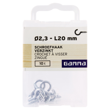 Deze GAMMA schroefhaak 2,3x20 mm verzinkt 10 stuks is gemaakt van verzinkt staal. De schroefhaak is 20mm lang. Schroefhaken hebben een normale schroefdraad. Ze lenen zich goed om zwaardere voorwerpen op te hangen aan een houten, stenen of betonnen wand, in combinatie met een plug. In menig huishouden hangt dan ook een schilderij, spiegel of klok aan een schroefhaak in de muur. Een koord, ijzerdraadje of lint blijft uitstekend haken achter het open oog. Om de schroefhaak vast. te draaien kunt u een schroevendraaier door de ring steken en als hefboom gebruiken om kracht te zetten. Eén verpakking bevat 10 stuks schroefhaken.