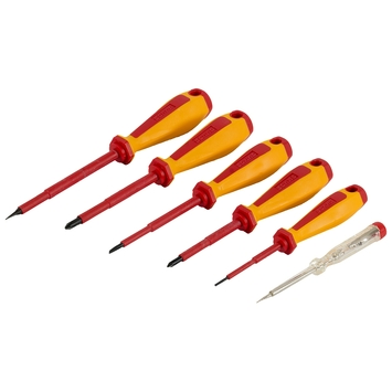 De 6-delige GAMMA-schroevendraaierset PH-SL 1000V bestaat uit 6 schroevendraaiers, gemaakt van chroom-vanadiumstaal. De 6 schroevendraaiers zijn geschikt voor Phillips-kruiskopschroeven met maat PH1 en PH2 en sleufkopschroeven met afmetingen van 2mm, 4mm, 5mm en 5,5mm. De 6-delige set bestaat dan ook uit een Phillips-1-kruiskopschroevendraaier, een Phillips-2-kruiskopschroevendraaier en 3 platte schroevendraaiers, oftewel sleufkopschroevendraaiers. De 6 PH- en sleufschroevendraaiers uit deze set zijn geïsoleerd tot 1000V. De geïsoleerde schroevendraaiers zijn dan ook voorzien van een VDE-keurmerk. Tevens is de set met PH- en SL-schroevendraaiers voorzien van een spanningzoeker voor het testen van wisselspanning van 120V tot 250V. Bekijk GAMMA’s assortiment ook wanneer u op zoek bent naar andere schroevendraaiersets.