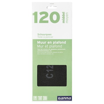 Het GAMMA schuurgaas muur en plafond grof K120 (3 stuks) is geschikt voor het schuren van gipsplaten, gasbetonblokken en pleisterwerk. Je gebruikt dit middelgrove gaas om oneffenheden weg te werken of om reparatiemiddel glad te maken. De set bevat drie vellen met een afmeting van 11,5 bij 28 centimeter.