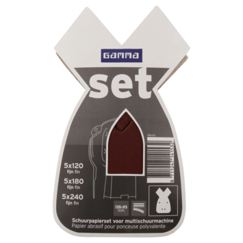 De Gamma schuurpapierenset 135x95mm is uitermate geschikt voor het schuren van oppervlakken. De set bestaat uit 15 vellen variërend in korrelgrootte/ grit; 5x K120, 5x K180 en 5x K240 (fijn). Het schuurpapier bevat klittenband en is geschikt voor een multischuurmachine/ mouse.