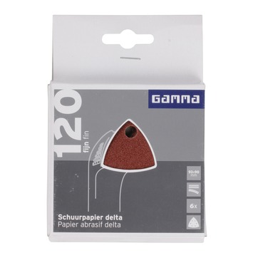Het Gamma schuurpapier 93x90mm is uitermate geschikt voor het schuren van oppervlakten. Dit schuurpapier heeft korrelgrootte/ grit K120 (fijn). Het schuurpapier bevat klittenband en is geschikt voor een deltaschuurmachine. De verpakking bevat 6 vellen.