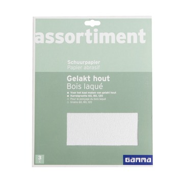 Het GAMMA schuurpapier watervast assortiment K240, K400, K600 is schuurpapier van het GAMMA eigen merk. Het schuurpapier is geschikt voor nat gebruik, zodat er stofvrij geschuurd kan worden. Er zitten 3 verschillende vellen in een verpakking, namelijk grof (240), middel (400) en fijn (600). Het schuurpapier met grove korrel kan worden gebruikt voor het opschuren van ruwe ondergronden, het schuurpapier met middel korrel kan worden gebruikt voor het vlakschuren van oneffenheden en het fijne schuurpapier gebruikt u om de ondergrond gereed te maken voor het aanbrengen van de eerste laklaag. Verpakt per 3 stuks.