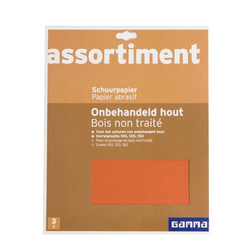 Het GAMMA schuurpapier voor onbehandeld hout assortiment K100, K120, K150 is schuurpapier van het GAMMA eigen merk. Het schuurpapier kan gebruikt worden op onbehandeld hout. Het papier met grove korrel kan worden gebruikt voor het opschuren van ruwe ondergronden, het schuurpapier met middel korrel kan worden gebruikt voor het vlakschuren van oneffenheden en het fijne schuurpapier gebruikt u om de ondergrond gereed te maken voor het aanbrengen van de eerste laklaag. Verpakt per 3 stuks.