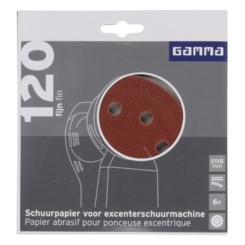 Het Gamma schuurpapier rond met diameter 115mm is uitermate geschikt voor het schuren van oppervlakten. Dit schuurpapier heeft korrelgrootte/ grit K120 (fijn). Het schuurpapier bevat klittenband en is geschikt voor een excenterschuurmachine. De verpakking bevat 6 vellen.