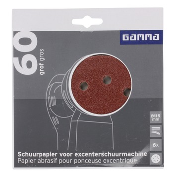 Het Gamma schuurpapier rond met diameter 115mm is uitermate geschikt voor het schuren van oppervlakten. Dit schuurpapier heeft korrelgrootte/ grit K60 (grof). Het schuurpapier bevat klittenband en is geschikt voor een excenterschuurmachine. De verpakking bevat 6 vellen.