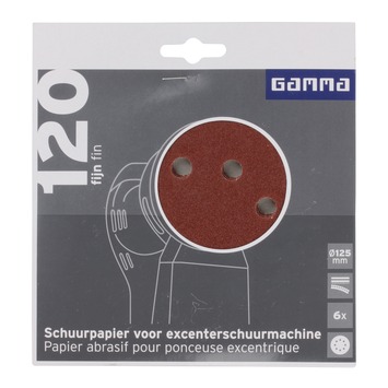 Het Gamma schuurpapier rond met diameter 125mm is uitermate geschikt voor het schuren van oppervlakten. Dit schuurpapier heeft korrelgrootte/ grit K120 (fijn). Het schuurpapier bevat klittenband en is geschikt voor een excenterschuurmachine. De verpakking bevat 6 vellen.