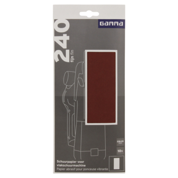 Het Gamma schuurpapier 230x93mm is uitermate geschikt voor het schuren van oppervlakten. Dit schuurpapier heeft korrelgrootte/ grit K240 (fijn). Het schuurpapier is geschikt voor een vlakschuurmachine. De verpakking bevat 10 vellen.