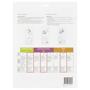 De vellen hebben een formaat van 23 bij 28 centimeter en zijn te gebruiken met de hand of op een schuurmachine. Door de variatie in korrel kun je met deze set stap voor stap werken van grof tot fijn, zonder telkens nieuw papier te hoeven zoeken.