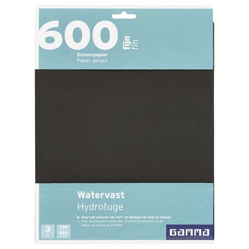 Het GAMMA schuurpapier watervast fijn K600 (3 stuks) gebruik je voor het nat of droog schuren van behandeld hout, metaal, glas, keramiek of polyester. De vellen hebben een fijne korrel van 600 en zijn geschikt om kleine oneffenheden weg te werken of een oppervlak glad te maken voor de laatste verf- of laklaag.