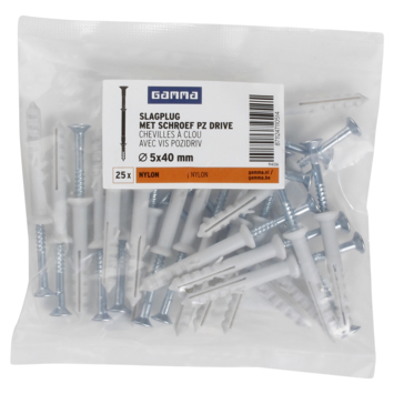 De GAMMA Slagplug nylon Ø 5x40mm met schroef is geschikt voor toepassing op verschillende soorten materialen zoals beton, wandverbinding en metaal. Nagelpluggen zijn zeer geschikt voor het monteren van houten regelwerk (zoals plinten). De werkwijze is anders dan bij een gewone plug en daarom is deze plug ook wel bekend als spijkerplug of nagelplug. Je slaat de plug namelijk met een hamer in het boorgat. Gebruik voor het boren van het gat een boor met een doorsnede van 5mm. De plug is 40mm lang. Bijpassende schroeven zijn 45mm lang en hebben een doorsnede van Ø 3,3 mm. Een verpakking bevat 25 slagpluggen.