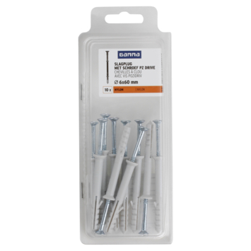 De GAMMA Slagplug nylon Ø 6x60mm met schroef is geschikt voor toepassing op verschillende soorten materialen zoals beton, wandverbinding en metaal. Nagelpluggen zijn zeer geschikt voor het monteren van houten regelwerk (zoals plinten). De werkwijze is anders dan bij een gewone plug en daarom is deze plug ook wel bekend als spijkerplug of nagelplug. Je slaat de plug namelijk met een hamer in het boorgat. Gebruik voor het boren van het gat een boor met een doorsnede van 6mm. De plug is 60mm lang. Bijpassende schroeven zijn 65mm lang en hebben een doorsnede van Ø 3,7 mm. Een verpakking bevat 10 slagpluggen.