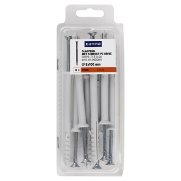 De GAMMA Slagplug nylon Ø 8x100mm met schroef is geschikt voor toepassing op verschillende soorten materialen zoals beton, wandverbinding en metaal. Nagelpluggen zijn zeer geschikt voor het monteren van houten regelwerk (zoals plinten). De werkwijze is anders dan bij een gewone plug en daarom is deze plug ook wel bekend als spijkerplug of nagelplug. Je slaat de plug namelijk met een hamer in het boorgat. Gebruik voor het boren van het gat een boor met een doorsnede van 8mm. De plug is 100mm lang. Bijpassende schroeven zijn 105mm lang en hebben een doorsnede van Ø 4,8 mm. Een verpakking bevat 8 slagpluggen.