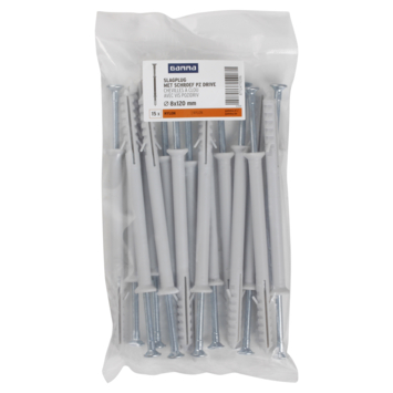 De GAMMA Slagplug nylon Ø 8x120mm met schroef is geschikt voor toepassing op verschillende soorten materialen zoals beton, wandverbinding en metaal. Nagelpluggen zijn zeer geschikt voor het monteren van houten regelwerk (zoals plinten). De werkwijze is anders dan bij een gewone plug en daarom is deze plug ook wel bekend als spijkerplug of nagelplug. Je slaat de plug namelijk met een hamer in het boorgat. Gebruik voor het boren van het gat een boor met een doorsnede van 8mm. De plug is 120mm lang. Bijpassende schroeven zijn 125mm lang en hebben een doorsnede van Ø 4,8 mm. Een verpakking bevat 15 slagpluggen.