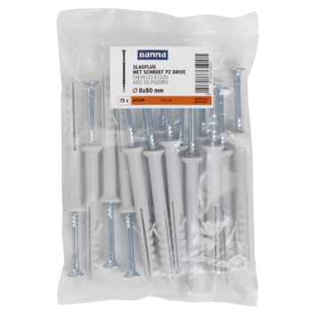 De GAMMA Slagplug nylon Ø 8x80mm met schroef is geschikt voor toepassing op verschillende soorten materialen zoals beton, wandverbinding en metaal. Nagelpluggen zijn zeer geschikt voor het monteren van houten regelwerk (zoals plinten). De werkwijze is anders dan bij een gewone plug en daarom is deze plug ook wel bekend als spijkerplug of nagelplug. Je slaat de plug namelijk met een hamer in het boorgat. Gebruik voor het boren van het gat een boor met een doorsnede van 8mm. De plug is 80mm lang. Bijpassende schroeven zijn 85mm lang en hebben een doorsnede van Ø 4,8 mm. Een verpakking bevat 15 slagpluggen.