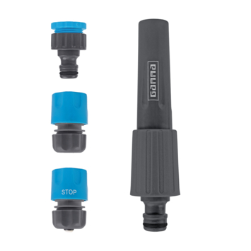 Met deze GAMMA tuinspuitset 4-delig heeft u de basis sproeigereedschappen in huis. Met de tuinspuit kunt u gericht sproeien in de tuin en dankzij de verstelring is het mogelijk te kiezen voor een fijne nevel of krachtige waterstraal. Ideaal als u naast uw tuin ook schoonmaakwerkzaamheden met de tuinspuit wilt uitvoeren. Het koppelen van de tuinspuit aan de slang is zeer eenvoudig dankzij de 1/2"inch (13mm) slangkoppeling. Bovendien is ook de koppeling aan de kraan eenvoudig met behulp van de stelring; hierdoor past de tuinspuitset op alle kranen van 3/4" (26,5mm) en 1 " inch (33mm) draad. Kleur: grijs met blauw.