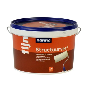 GAMMA structuurverf fijn wit 2,5 liter is een goed dekkende, stootvaste structuurverf met fijne kwartskorrels. Het product weegt 30% minder dan een normale structuurverf en is daardoor gemakkelijk verwerkbaar. Het is toe te passen als decoratieve, stootvaste afwerklaag op muren en plafonds. De structuurverf is eenvoudig aan te brengen met een muurverfroller. Eén emmer van 2,5 liter volstaat voor het schilderen van een oppervlakte van 6 m2.