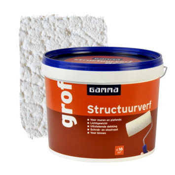 GAMMA structuurverf grof wit 10 liter is een goed dekkende, stootvaste structuurverf met grove kwartskorrels. Het product weegt 30% minder dan een normale structuurverf en is daardoor gemakkelijk verwerkbaar. Het is toe te passen als decoratieve, stootvaste afwerklaag op muren en plafonds. De structuurverf is eenvoudig aan te brengen met een muurverfroller. Eén emmer van 10 liter volstaat voor het schilderen van een oppervlakte van 16 m2.