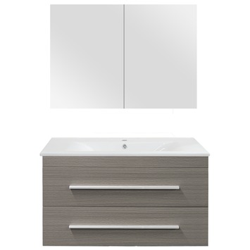 Zoekt u een modern en praktisch badmeubel voor uw badkamer? Deze 90cm brede Style-badmeubelset van GAMMA in de kleur eiken donkergrijs is eigentijds vormgegeven, compact en biedt toch voldoende opbergruimte. De badmeubelset van 90cm breed bestaat uit een onderkast van hoogwaardig MDF, een wastafel met overloop van keramiek en een spiegelkast met twee deuren. Het badmeubel is fijn in gebruik dankzij de geleidelijk en stil sluitende laden en spiegeldeuren die zijn uitgevoerd met softclose ladegeleiders en scharnieren. U sluit en opent de laden met behulp van de fraai vormgegeven aluminium grepen. Bovendien is de complete eikendonkergrijze badmeubelset eenvoudig te bevestigen.
