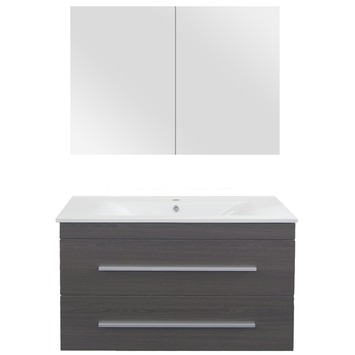 Zoek je een modern en praktisch badmeubel voor jouw badkamer? Deze 90cm brede Style-badmeubelset van GAMMA in de kleur eiken zwart is eigentijds en compact vormgegeven. Het badmeubel biedt voldoende opbergruimte voor handdoeken en toiletartikelen. De badmeubelset van 90cm breed bestaat uit een onderkast van hoogwaardig MDF, een wastafel met overloop van keramiek en een spiegelkast met twee deuren. Het eikenzwarte badmeubel is fijn in gebruik dankzij de geleidelijk en stil sluitende laden en spiegeldeuren die zijn uitgevoerd met softclose ladegeleiders en scharnieren. Je sluit en opent de laden met behulp van de fraai vormgegeven aluminium grepen. Bovendien is de complete eikenzwarte badmeubelset eenvoudig te bevestigen.