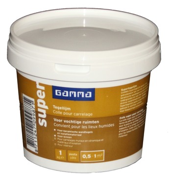 Gamma supertegellijm pasta wit 1 kilogram is een gebruiksklare lijm voor het verlijmen van keramische wandtegels op verschillende ondergronden en voor het verlijmen van diverse isolatiematerialen. Gamma supertegellijm pasta is geschikt voor gebruik in vochtige ruimten. Voor toepassingen binnenshuis.