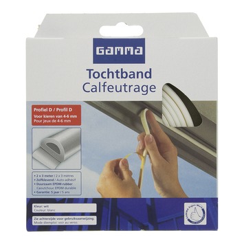 Deze GAMMA tochtband D-profiel EPDM rubber wit 3m 2 stuks is te gebruiken voor kieren van 4-6mm. De witte band heeft een zelfklevende strip, waardoor u deze eenvoudig in de te dichten sponning plakt. Dankzij het stevige rubber kan de tochtband voor lange tijd blijven zitten. Kortom, een duurzame oplossing waarmee u vocht, stof en kou met gemak buiten de deur houdt.
