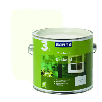 GAMMA tuinbeits dekkend kiezelwit 2,5 liter is ideaal voor het langdurig beschermen van bijvoorbeeld uw tuinhuis, schutting en pergola, ook als deze geïmpregneerd zijn. Deze glanzende, dekkende beits is een oplosmiddel houdend product en is beschikbaar in diverse dekkende en transparante kleuren. Het product is weersbestendig, waterafstotend, vochtregulerend en dringt diep door in het hout. Het rendement van één blik van 2,5 liter is ongeveer 30 m2. Op onbehandeld hout is het aan te bevelen om 3 lagen aan te brengen, op hout in goede staat volstaan 2 lagen. Gebruik van grondverf is niet nodig.