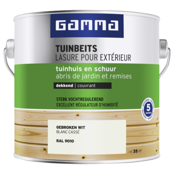 GAMMA Tuinbeits voor tuinhuis & schuur RAL 9010 gebroken wit 2,5 liter is een dekkende, glanzende beits op basis van terpentine. Voor een bescherming tot 5 jaar van bijvoorbeeld een schuur of tuinhuis. GAMMA tuinbeits dekkend dringt goed in het hout en maakt het hout sterk vochtregulerend, weerbestendig en waterafstotend. Dekkende tuinbeits dekt de houtnerf af, de natuurlijke structuur van het hout blijft wel zichtbaar. Geschikt voor zowel onbehandeld als geïmpregneerd hout. Voorbehandelen met grondverf is niet nodig. Stofdroog na ± 4 uur en overschilderbaar na ± 18 uur. Schilder in dunne lagen en laat goed drogen voordat je de volgende laag opzet.