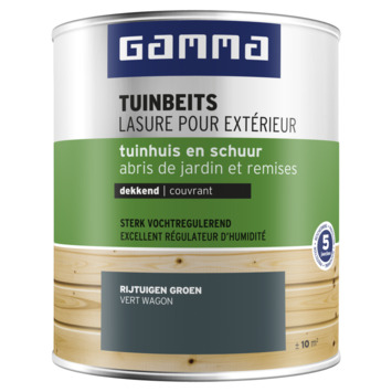 GAMMA Tuinbeits voor tuinhuis & schuur rijtuigengroen 750 ml is een dekkende, glanzende beits op basis van terpentine. Voor een bescherming tot 5 jaar van bijvoorbeeld een schuur of tuinhuis. GAMMA tuinbeits dekkend dringt goed in het hout en maakt het hout sterk vochtregulerend, weerbestendig en waterafstotend. Dekkende tuinbeits dekt de houtnerf af, de natuurlijke structuur van het hout blijft wel zichtbaar. Geschikt voor zowel onbehandeld als geïmpregneerd hout. Voorbehandelen met grondverf is niet nodig. Stofdroog na ± 4 uur en overschilderbaar na ± 18 uur. Schilder in dunne lagen en laat goed drogen voordat je de volgende laag opzet.