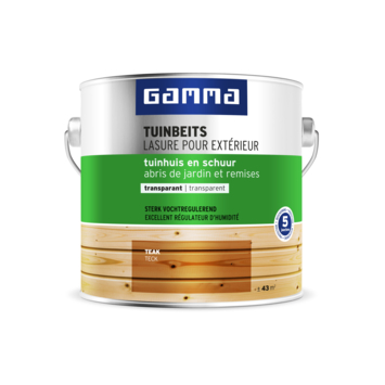 GAMMA Tuinbeits voor tuinhuis & schuur teak 2,5 liter is een transparante beits op basis van terpentine. Voor een bescherming tot 5 jaar van bijvoorbeeld een schuur of tuinhuis. GAMMA Tuinbeits transparant dringt goed in het hout en maakt het hout sterk vochtregulerend, weerbestendig en waterafstotend. Geschikt voor zowel onbehandeld als geïmpregneerd hout. Na het behandelen blijft de natuurlijke structuur en nerf van het hout goed zichtbaar. Stofdroog na ± 4 uur en