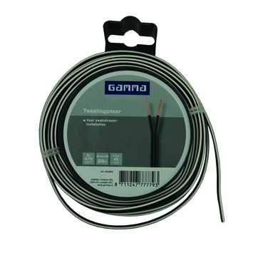 Het tweelingsnoer (VTLMB) 2x0,75 mm² van Gamma is geschikt om een deurbel, luidsprekers of andere zwakstroominstallaties aan te sluiten, met een maximale spanning van 42V. Lengte: 20 meter. Kleur: zwart.