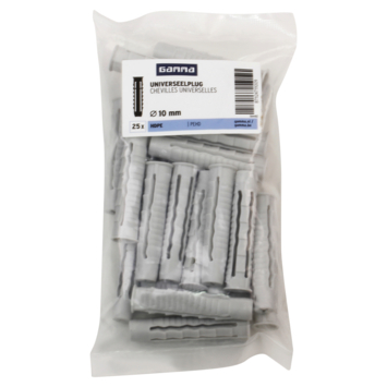 De GAMMA Universeelplug HDPE Ø 10mm is voor meerdere materialen te gebruiken De plug is zowel geschikt voor beton, massieve als geperforeerde steen, en ook voor holle wanden. De kop van de plug wordt namelijk door de schroef naar achteren getrokken en vormt in holle bouwmaterialen een soort knoop. Een handige plug dus om op voorraad te hebben, zodat je altijd een geschikte plug in huis hebt. De plug is 50mm lang, voor het beste resultaat adviseren wij een minimale boordiepte te hanteren van 60mm . Een verpakking bevat 25 pluggen. Deze plug is geschikt voor schroeven tussen 6 en 8mm met een minimale lengte van 55mm
