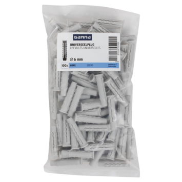 De GAMMA Universeelplug HDPE Ø 6mm is voor meerdere materialen te gebruiken De plug is zowel geschikt voor beton, massieve als geperforeerde steen, en ook voor holle wanden. De kop van de plug wordt namelijk door de schroef naar achteren getrokken en vormt in holle bouwmaterialen een soort knoop. Een handige plug dus om op voorraad te hebben, zodat je altijd een geschikte plug in huis hebt. De plug is 30mm lang, voor het beste resultaat adviseren wij een minimale boordiepte te hanteren van 35mm . Een verpakking bevat 100 pluggen. Deze plug is geschikt voor schroeven tussen 3 en 4mm met een minimale lengte van 35mm