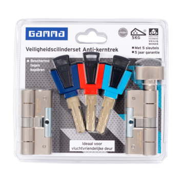 GAMMA veiligheidscilinderset push met kerntrekbeveiliging bestaat uit een tweetal cilinders; 1 met pushknop cilinder en 1 cilinder maat 32/32. Een cilinder met pushknop is als een normale knopcilinder alleen moet eerst de knop ingedrukt worden voordat deze kan draaien. Deze functie zorgt ervoor dat het extra moeilijk wordt voor een inbreker om de deur te openen. (dit systeem is getest door SKG) Deze cilinders hebben beide een kerntrek beveiliging (inbraakmethode nummer 1 in Nederland), het voordeel van deze cilinders is dat je geen beslag nodig hebt met kerntrekbeveiliging. Deze cilinder heeft de hoogte normering (SKG 3) en is extra zwaar inbraak werend doordat hij een hardstalen brug heeft. De veiligheidscilinderset wordt geleverd incl. bevestigingsmateriaal, en is geschikt voor deuren met een dikte van 38-42 mm. Andere maten zijn te bestellen. Het is mogelijk extra sleutels en cilinders (bij) te bestellen. Een cilinder mag nooit meer dan 3mm uit het beslag uitsteken.